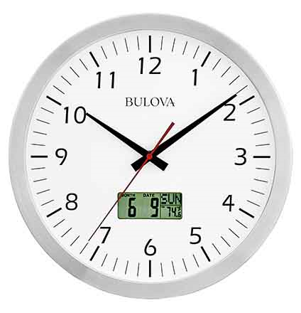 C4810 MANAGER Oversize wall clock with industrial look, featuring clean, brushed aluminum case, glass lens, and quartz movement. Bright white dial and bold numerals allow easy reading from a distance, while the digital feature displays month/date/day, and Fahrenheit or Celsius room temperature readouts. Requires (1) AA battery for clock and (1) AAA battery for LCD display, not included.