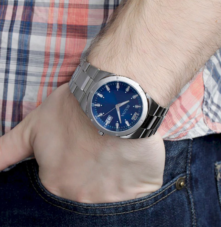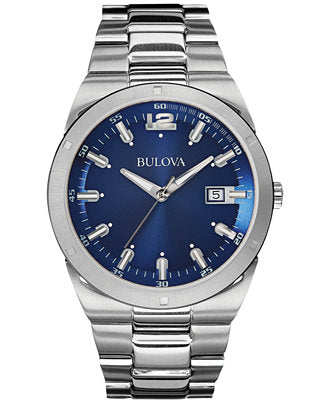 Men's Bulova 96B220. Designed with authentic styling and meticulous detail, this watch offers the essentials for dress, career and casual wear. This watch boasts a blue dial with date display. The reliable Japanese quartz movement provides accurate time keeping. Water-resistant up to 50 metres and securing with a polished stainless steel link bracelet with fold-over clasp, this watch includes a three-year limited manufacturer warranty. We are an authorized Bulova dealer.