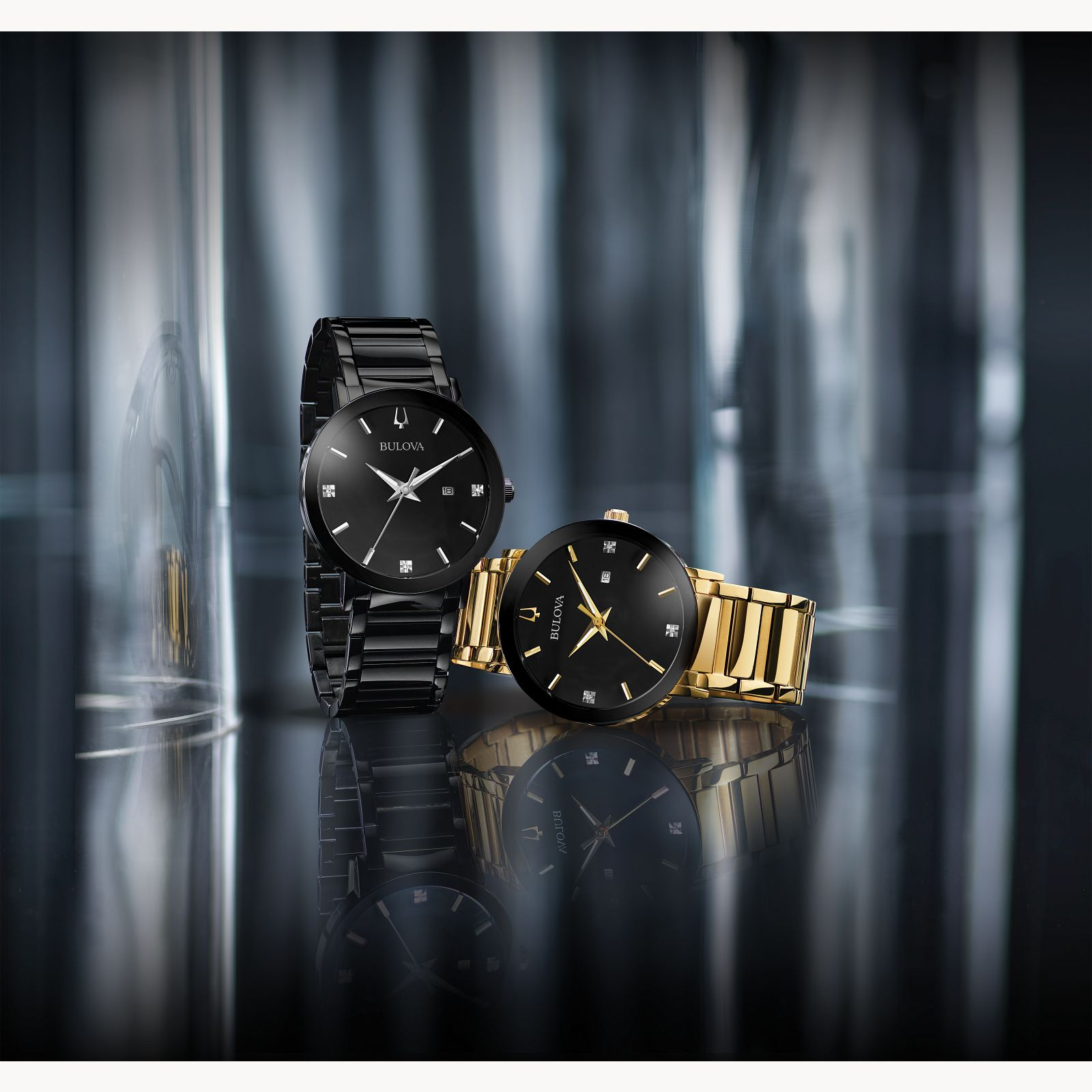 Bulova 98D144. From the Modern Collection. In black IP stainless steel with three diamonds on black dial, three-hand date feature, metalized edge-to-edge curved crystal, screw-back case, black IP stainless steel bracelet with deployant closure, and waterresistance to 30 metres. Calibre: GM10
