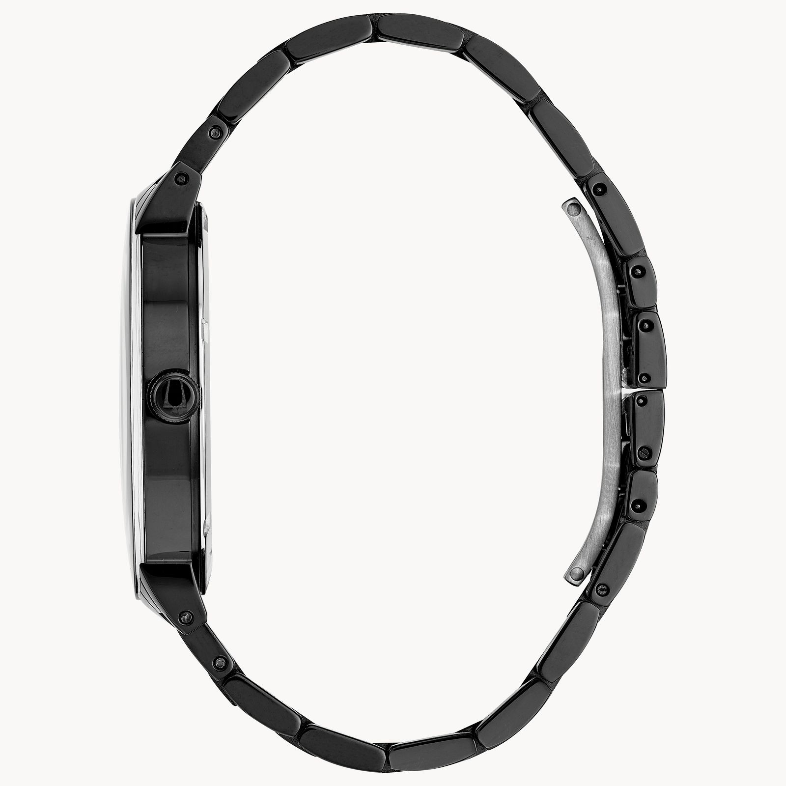 Bulova 98D144. From the Modern Collection. In black IP stainless steel with three diamonds on black dial, three-hand date feature, metalized edge-to-edge curved crystal, screw-back case, black IP stainless steel bracelet with deployant closure, and waterresistance to 30 metres. Calibre: GM10