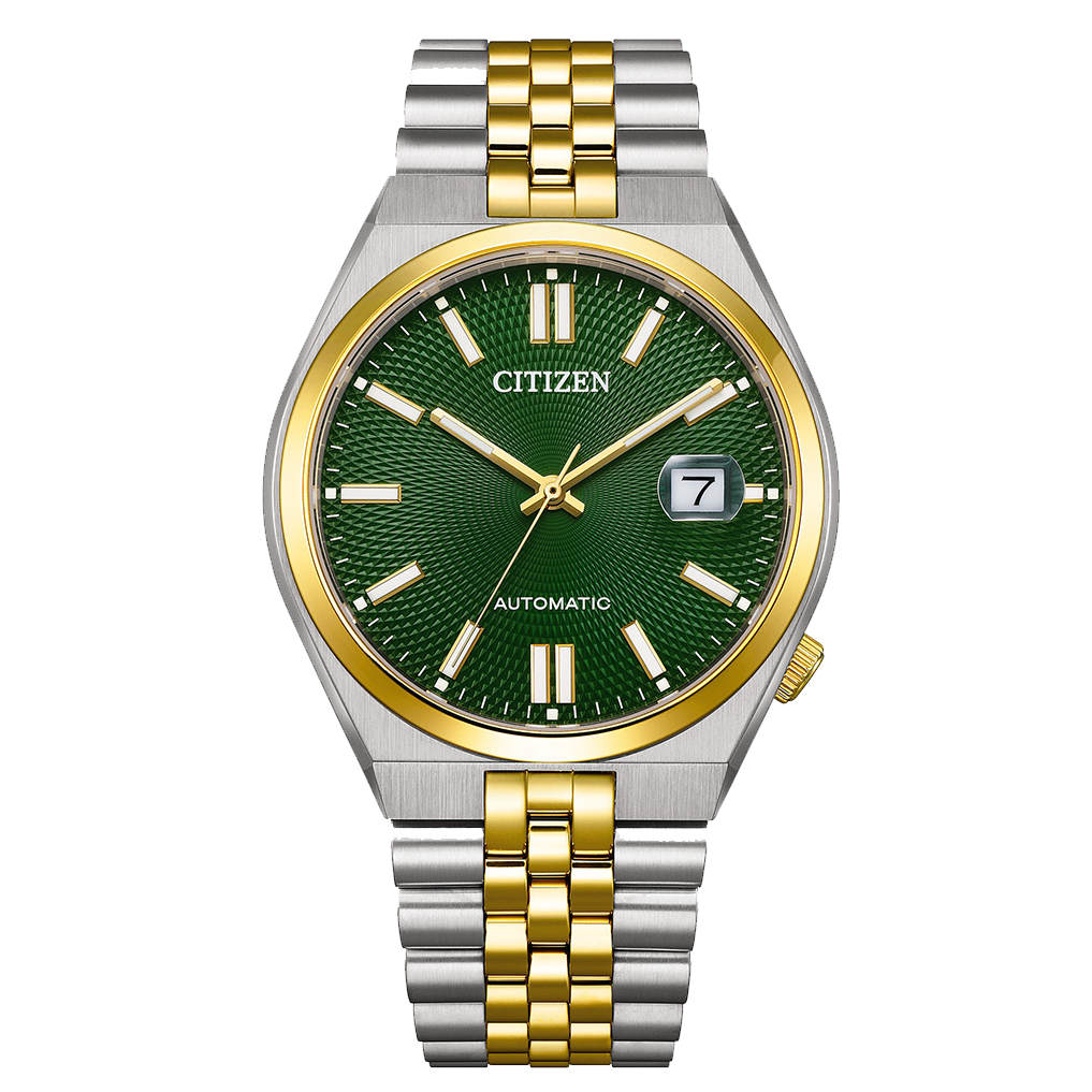The Citizen Tsuyosa 60 Automatic NK0024-54X delivers sleek design with standout styling. Encased in a 40 mm stainless steel body, it features a radiant sunray green dial with gold-tone accents, luminous hands, and a magnified date display under sapphire crystal. The powerful automatic movement boasts an extended 60-hour power reserve, while the exhibition case back reveals the precision mechanics within. Paired with an integrated stainless steel bracelet blending brushed and polished links, and offering 50 m water resistance—this timepiece effortlessly balances bold color, craftsmanship, and enduring performance.