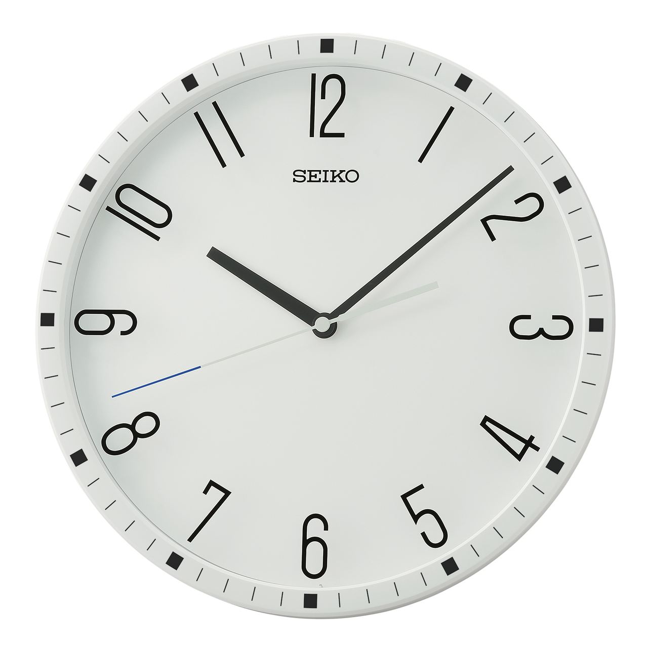 Seiko Wall Clock is where time meets modern design. This analog round wall clock features unique elongated numerals. Available in black or white. Numerals are printed on the glass while markers are printed on the front case for a distinctive modern look.The quiet sweep second hand continuously glides around the clock, eliminating annoying ticking sounds. Powered by 1 AA battery (included). Overall dimensions: 12.2 X 12.2 X 1.5 inches. Quartz crystal movement allows for the most accurate time keeping. Perfect for tween to adult.