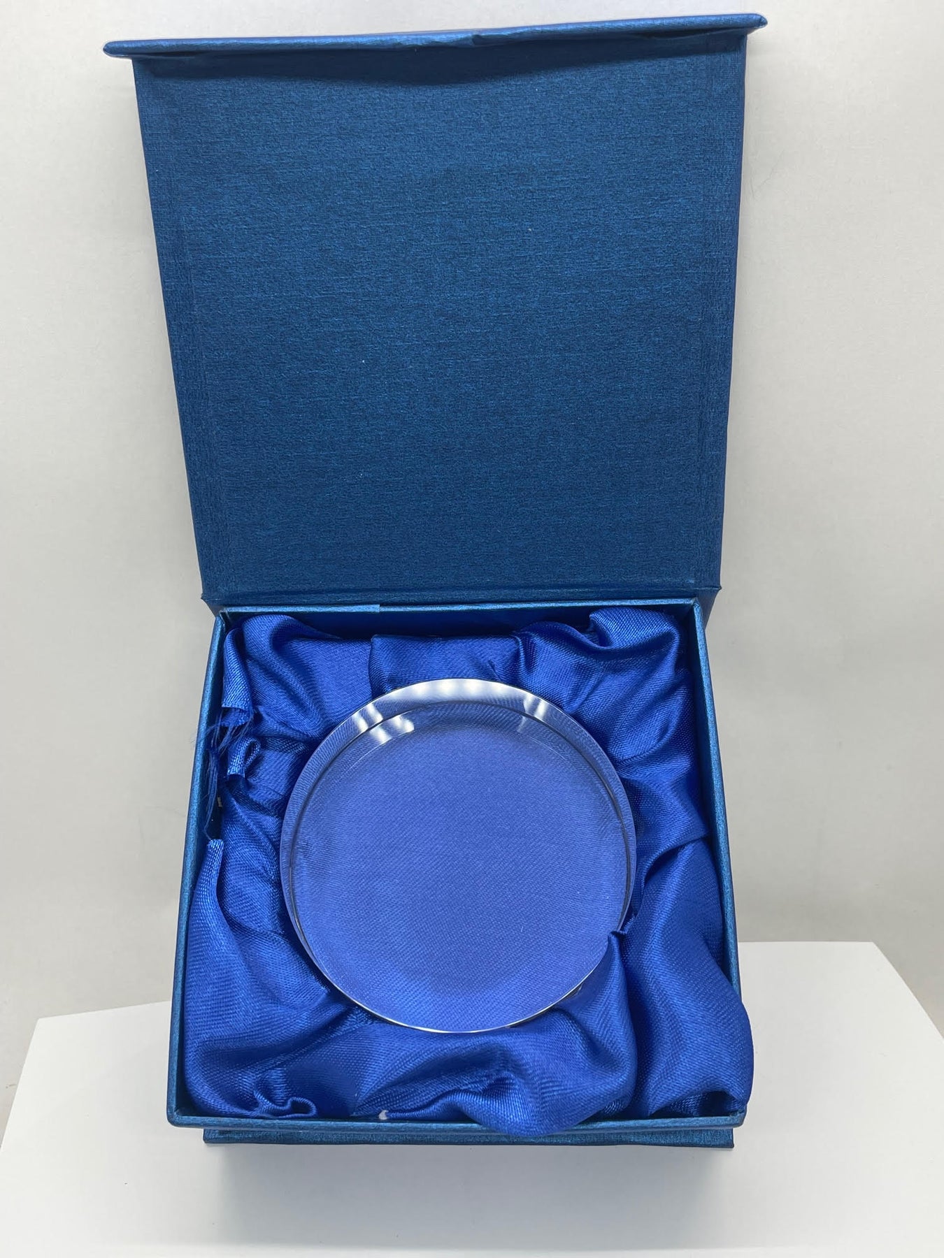 3" round Glass Paperweight/Award. laser Engravable with your company/team name comes gift boxed. Quantity Discounts available