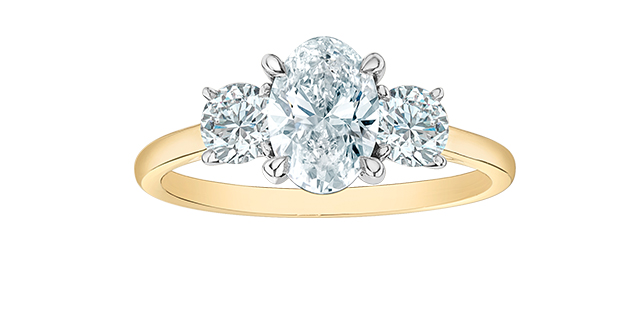 Lady's Yellow/White 14 Karat 3 Stone Engagement Ring Size 7 With One 0.74Ct Oval Shape E Vs2 Lab Grown Diamond And 2=0.30Tw Oval Shape E Vs2 Lab Grown Diamonds