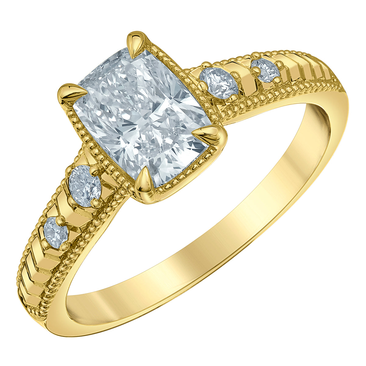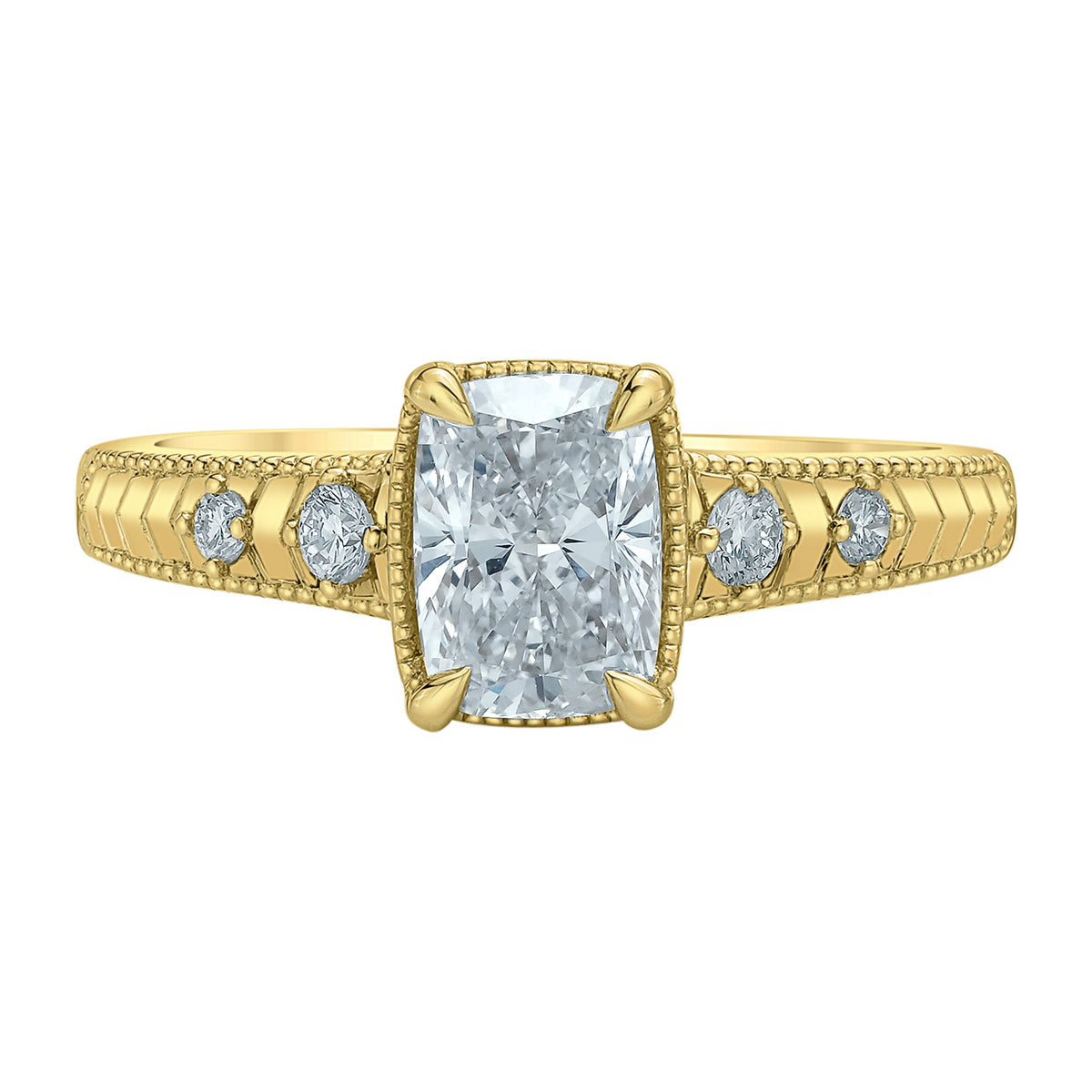 Lady's Yellow Gold 14K Engagement Ring Size 6.25 With One = 1.07Ct Cushion Cut D Vs1 Lab Grown Diamond, 2 = 0.08Tw Round Brilliant Cut Lab Grown Diamonds And 0.04 Lab Grown Diamonds