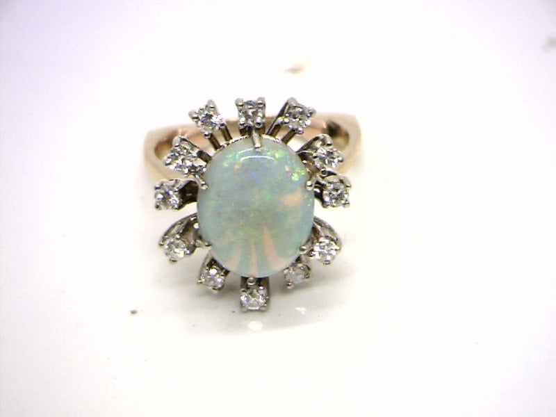 Lady's Yellow/White 18 Karat Fashion Ring Size 6.5 With One 12.00X9.50Mm Oval Moderately Bright Opal And 12=0.36Tw Round Brilliant Cut G/H Si1 Diamonds Weight: 6