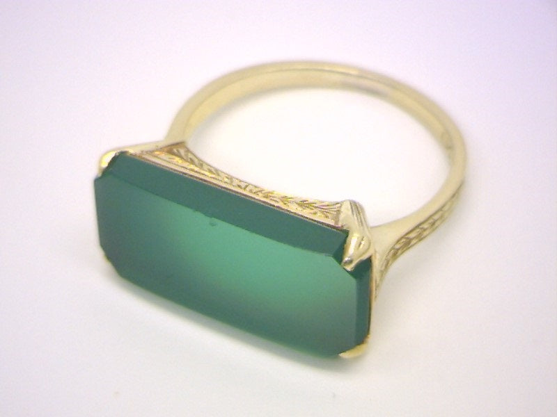 Lady's Yellow Gold 14K Engraved Fashion Ring Size 6 With One = 18.00X9.00Mm Retangular Cushion Green Jade Weight: 3.2