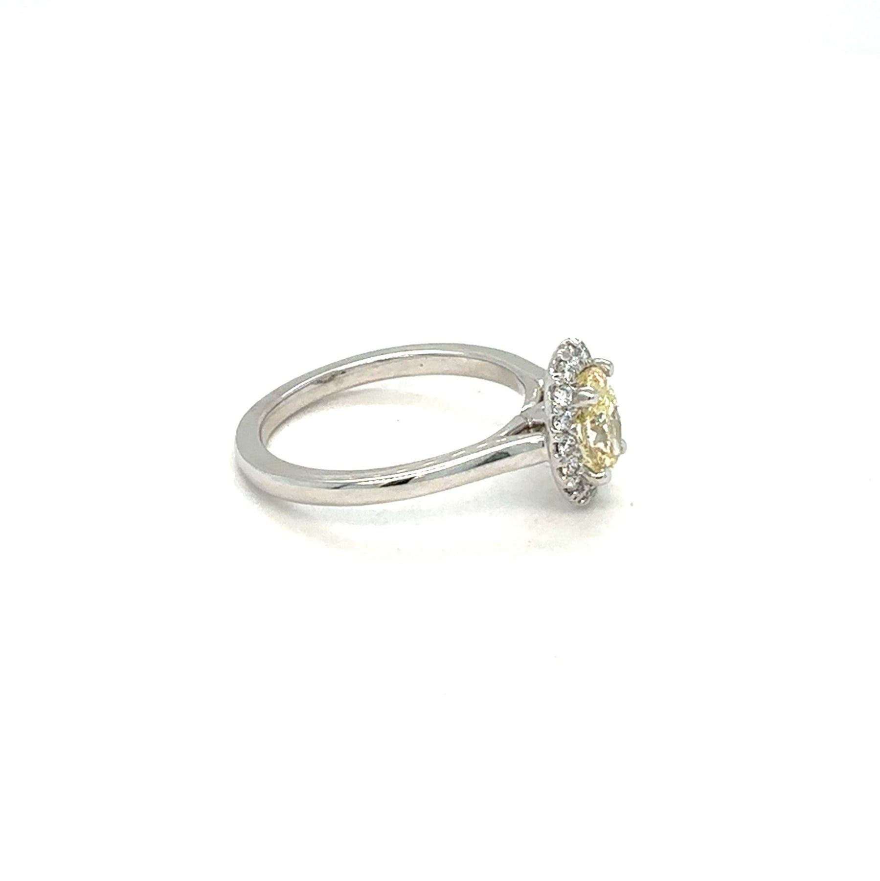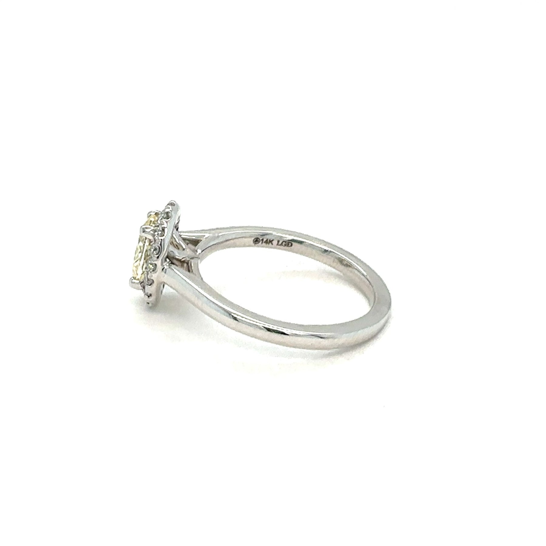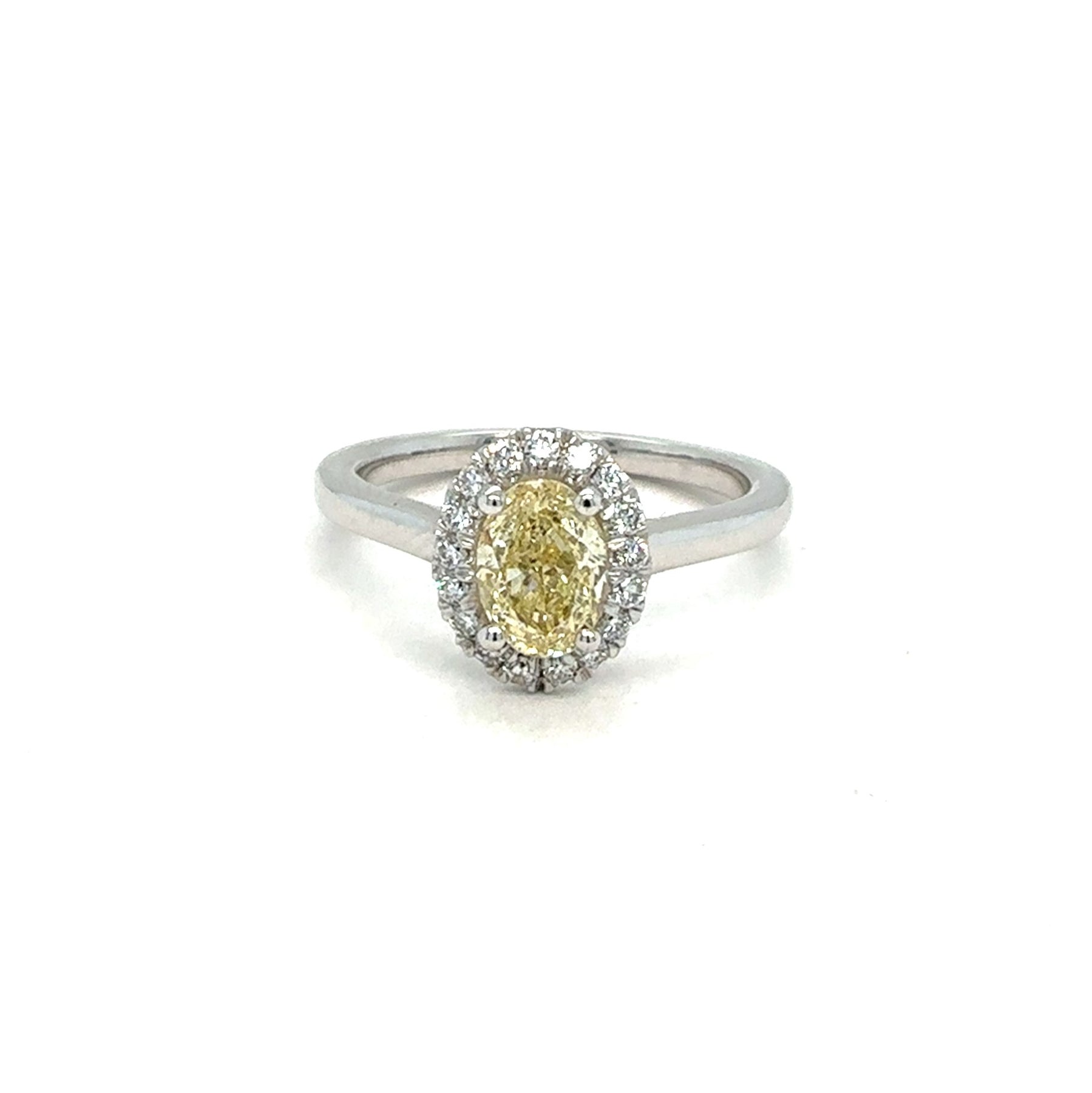 Lady's White Gold 14K Halo Engagement Ring Size 6.5 With One = 1.03Ct Oval Shape Vvs1 Intense Yellow Diamond And 17 = 0.20Tw Round Brilliant Cut D Vvs1 Diamonds