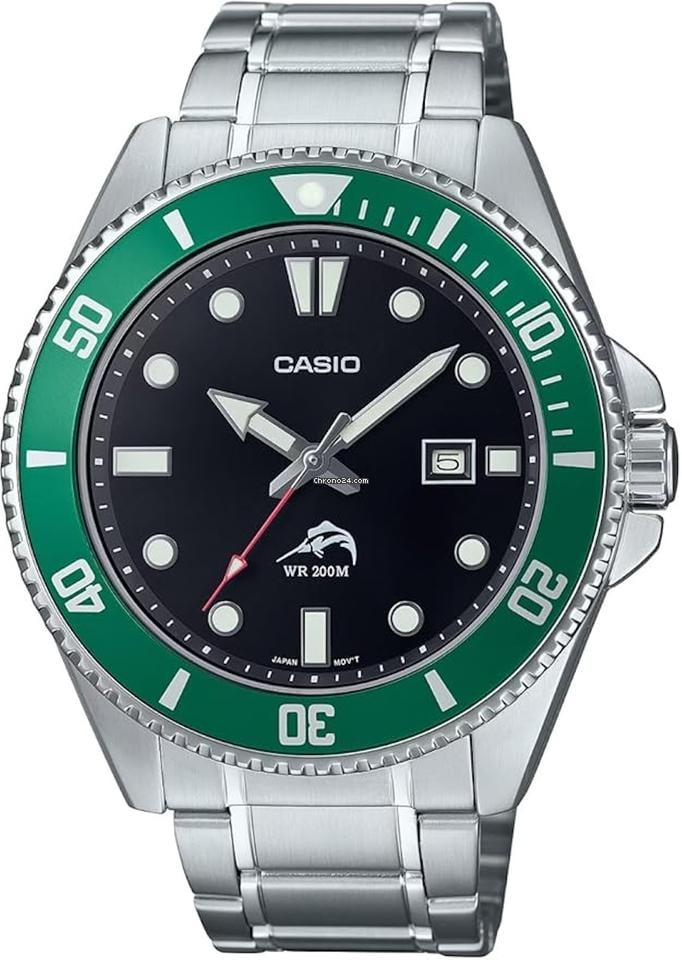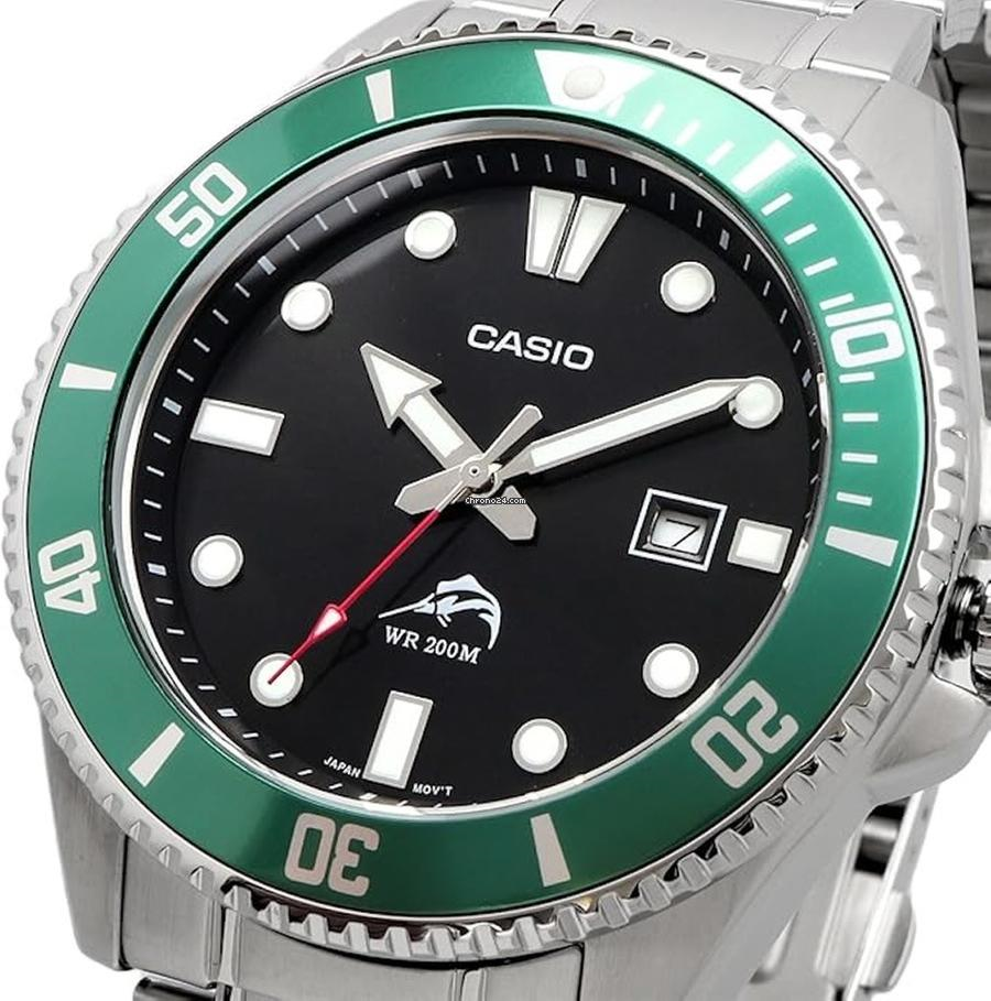The Casio MDV106DD-1A3 is a durable and affordable stainless steel dive-style watch featuring a green bezel, a 200-meter water resistance rating, and a classic analog display with a date function. It has a robust stainless steel case and band, a secure screw-lock crown and case back, and a reliable battery-powered movement with approximately a 3-year life. The watch's classic design, large face, and heavy build make it a versatile option for everyday wear and water activities.