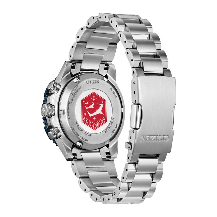 On the wrist, the watch's silver-tone stainless steel case measures 40mm in diameter, wearing boldly with its sharp faceting and satin finishing, while a slide-rule scale on the bidirectional blue and red ion-plated bezel provides additional flight utility. A triple-link stainless steel bracelet secures the timepiece. On the dial, a Snowbirds colourway with black accents adds to the watch's superior legibility, while a sapphire crystal and 200m of water resistance protect it all. Functions include a 1/5 second chronograph measuring up to 60 minutes, 12/24 hour time displays, and a date indicator. The movement is protected via a Snowbirds' insignia-signed case back, and is powered by our proprietary Eco-Drive technology – sustainably powered by light and never needing a battery. Calibre B620.