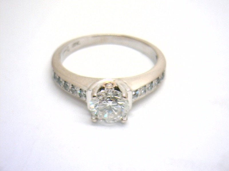 Lady's White Gold 18K Designer Simon G Solitaire With Side Stones Engagement Ring Size 6 With One = 1.00Ct Round Brilliant Cut G I1 Diamond And 12 = 0.12Tw Round Brilliant Cut G Si2 Diamonds Weight: 4.1
