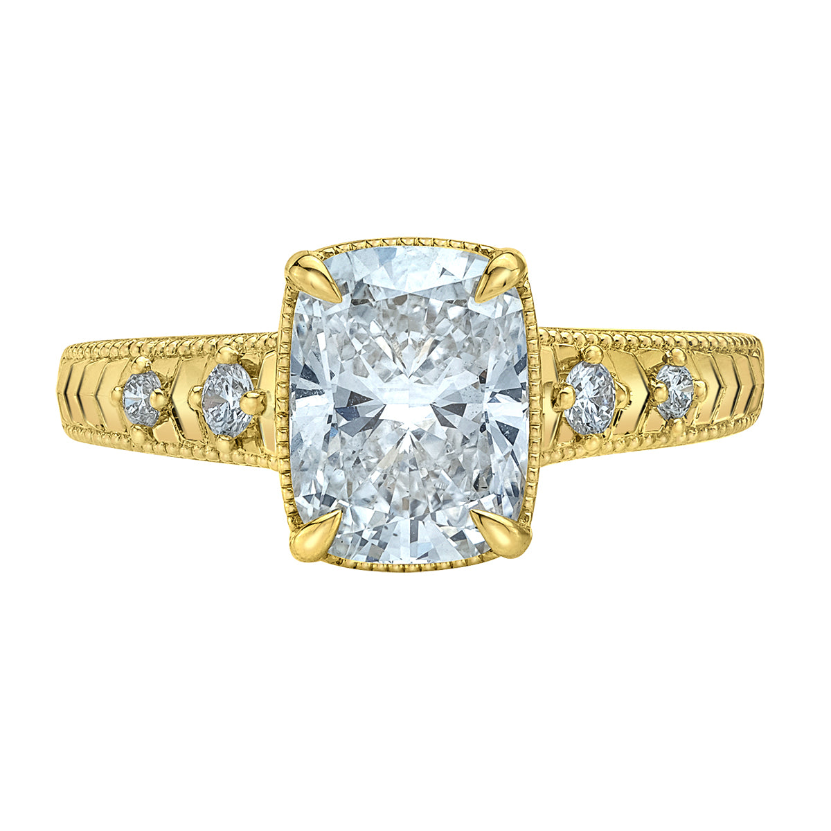 Lady's Yellow Gold 14K Engagement Ring Size 6.25 With One = 2.06Ct Cushion Cut E Vs2 Lab Grown Diamond, 2 = 0.08Tw Round Brilliant Cut Lab Grown Diamonds And 0.04 Twt Lab Grown Diamonds.