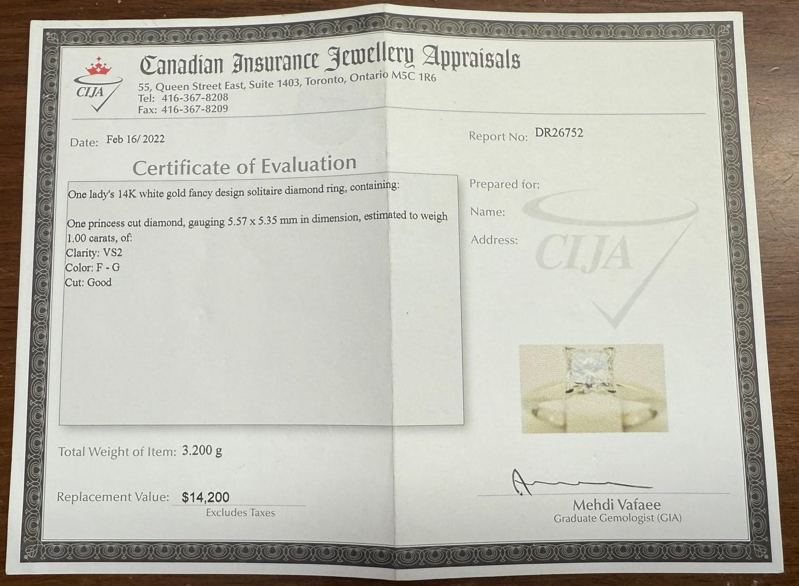 Lady's White Gold 14K Solitaire Engagement Ring Size 6 With One = 1.00Ct Princess Cut F/G Vs2 Diamond Weight: 3.2