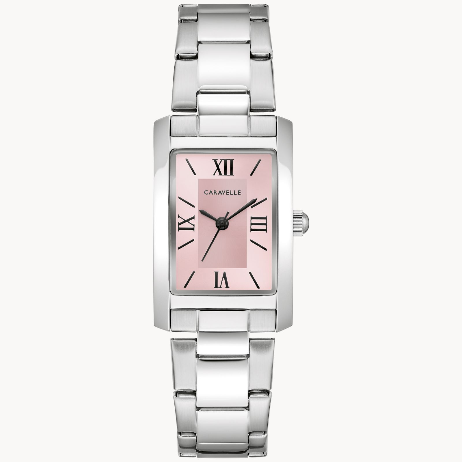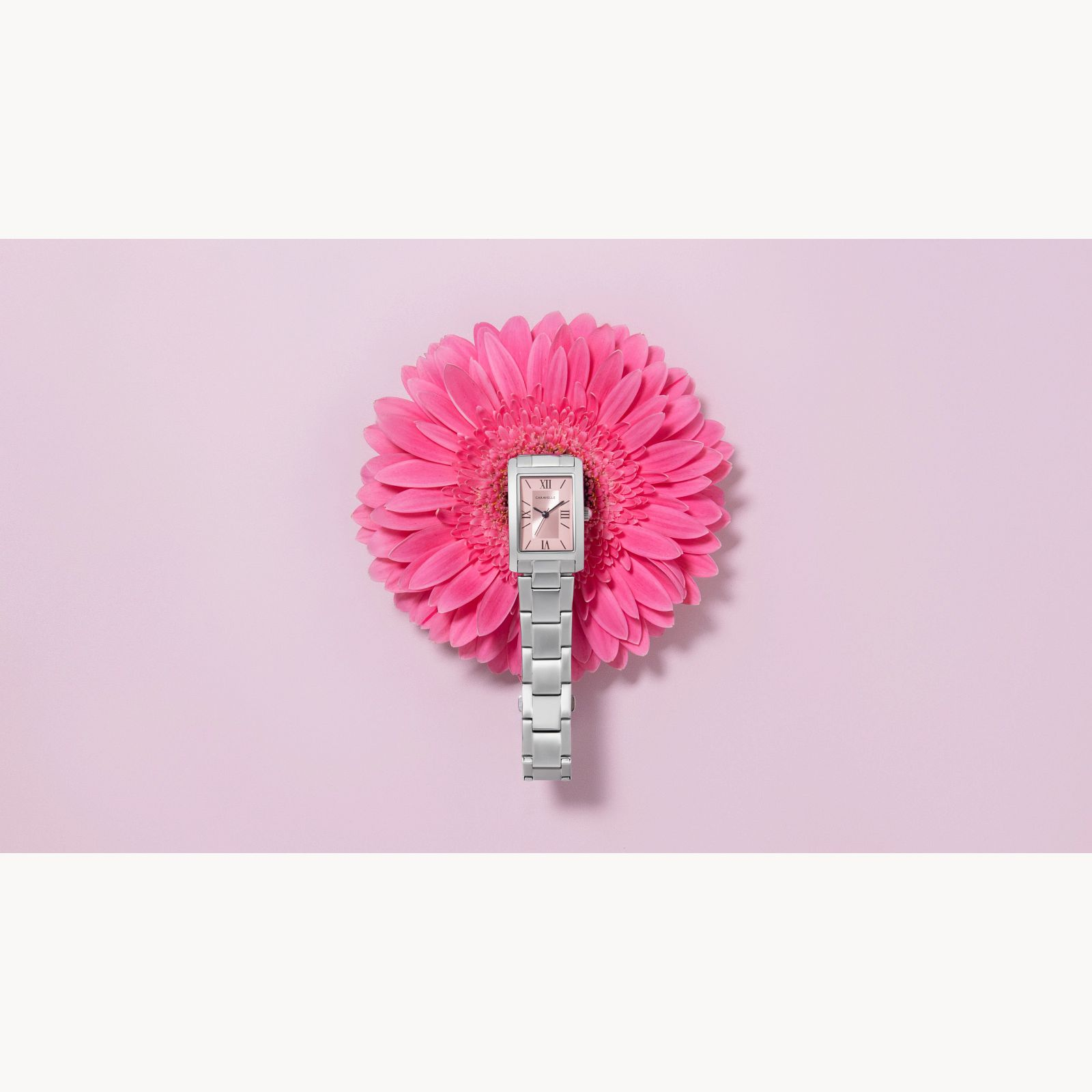Look pretty in pink all year long with this charmingly elegant Caravelle women’s watch. At once bold and refined, the silver-tone stainless steel case is polished throughout while a curved mineral crystal maintains the stylish silhouette. Printed black Roman numeral and baton markers are complemented by black sword hands that provide stunning contrast against the radiant split-finish pink dial. The watch transitions seamlessly to the matching silver-tone bracelet, which features a push-button folding closure for exemplary comfort. An everyday essential that can be dressed up or down, this Caravelle ladies’ timepiece is the perfect addition to any collection.