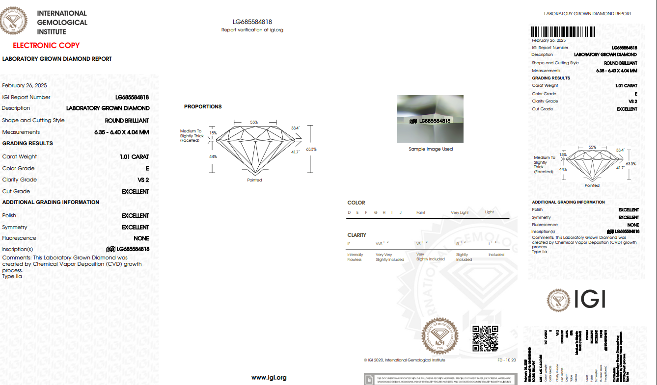 Loose Diamond one = 1.01ct Round Brilliant Cut E VS2 Lab Grown Diamond. IGI Cert lg685584818